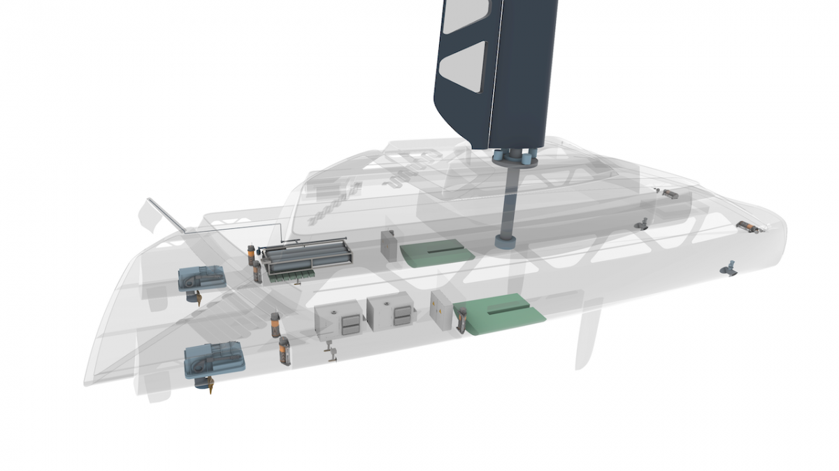 When wind is insufficient, propulsion will come from retractable 500-kilowatt electric drive units, supported by a 580-kilowatt-hour battery bank, hydrogen fuel cells, hydro-generators and HVO-fuelled gensets. Each 500-kilowatt retractable pod is derived from the RPS units developed for 60-metre sailing yacht Sarissa, providing silent, emission-free manoeuvring when powered by the yacht’s batteries. Performance projections indicate a cruising speed of 12 knots, a 14-knot top speed and transatlantic range at 8 knots under power alone.
