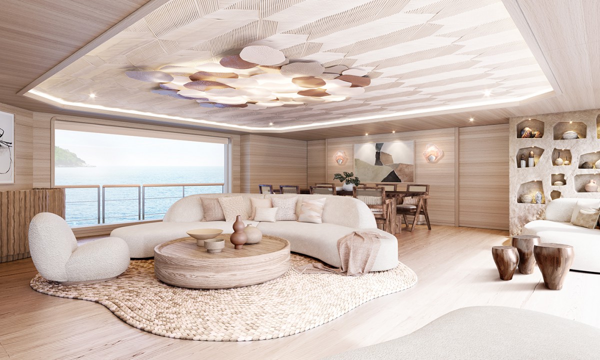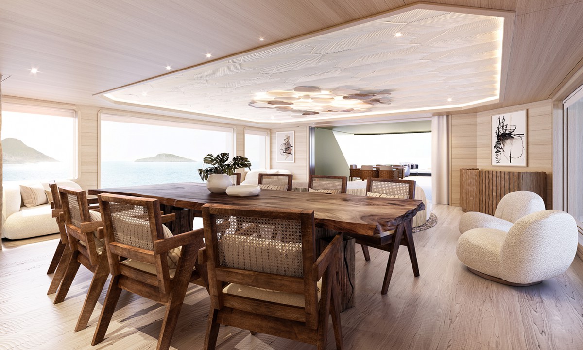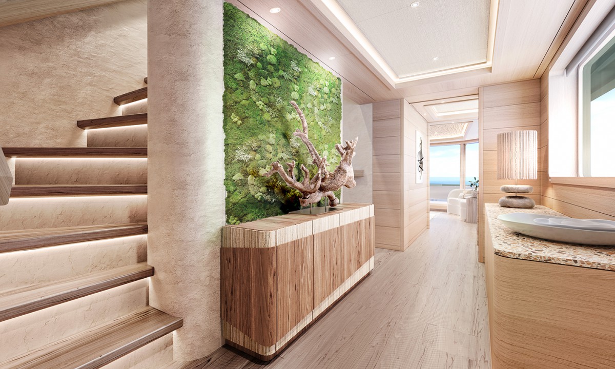 This year, Winch Design will be delivering Nasiba [pictured above and below]– a groundbreaking 44-metre Cantiere delle Marche explorer featuring the industry’s first ‘health-focused’ interior, with low VOCs* and low EMFs† throughout, designed for a health and wellness-conscious family pursuing their own version of deliberate yachting. Every design element connects to natural themes, and rigorous measurements of VOCs and EMFs guide every material decision. The interior features include a dining table crafted from 350-year-old felled wood, sculptural side tables made of rush grass, wardrobes lined in pressed alpine hay and flowers, a green living wall made of preserved moss, a cork marquetery map of the world, a ‘tree of life’ feature formed from fallen trees and designed to display treasures from the family’s adventures … This represents just one example of how owners are aligning their vessels with deeply held values.