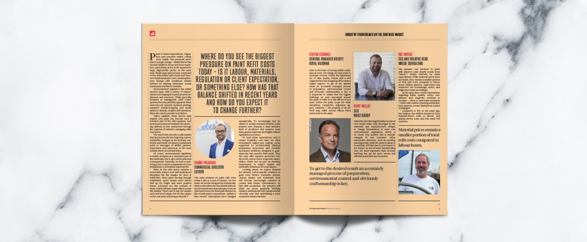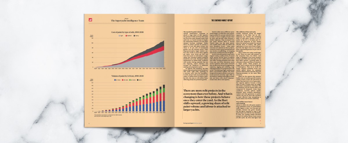 Nowhere is this more apparent than in the paint shed. Constantly cited as the number one cause of client-induced headaches and arguments, paint is a market under immense pressure from all angles. Working alongside Wrede Consulting, Superyacht Intelligence presents a five-year forecast of the paint refit market as the first article of this edition, examining the volume of paint required, the number of skilled hours available and the associated costs.