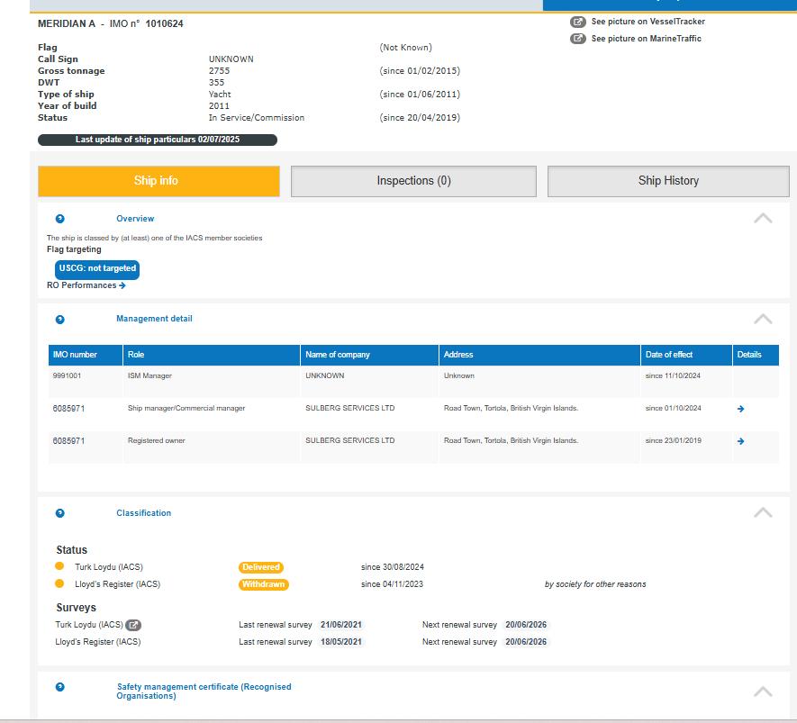 Public data, notably from Equasis (IMO 1010624), indicates that the yacht has been registered since 2019 under Sulberg Services Ltd, acting both as registered owner and commercial manager. Such data reflects a formal situation, but it does not, in itself, establish the identity of the ultimate beneficial owner or the reality of control.